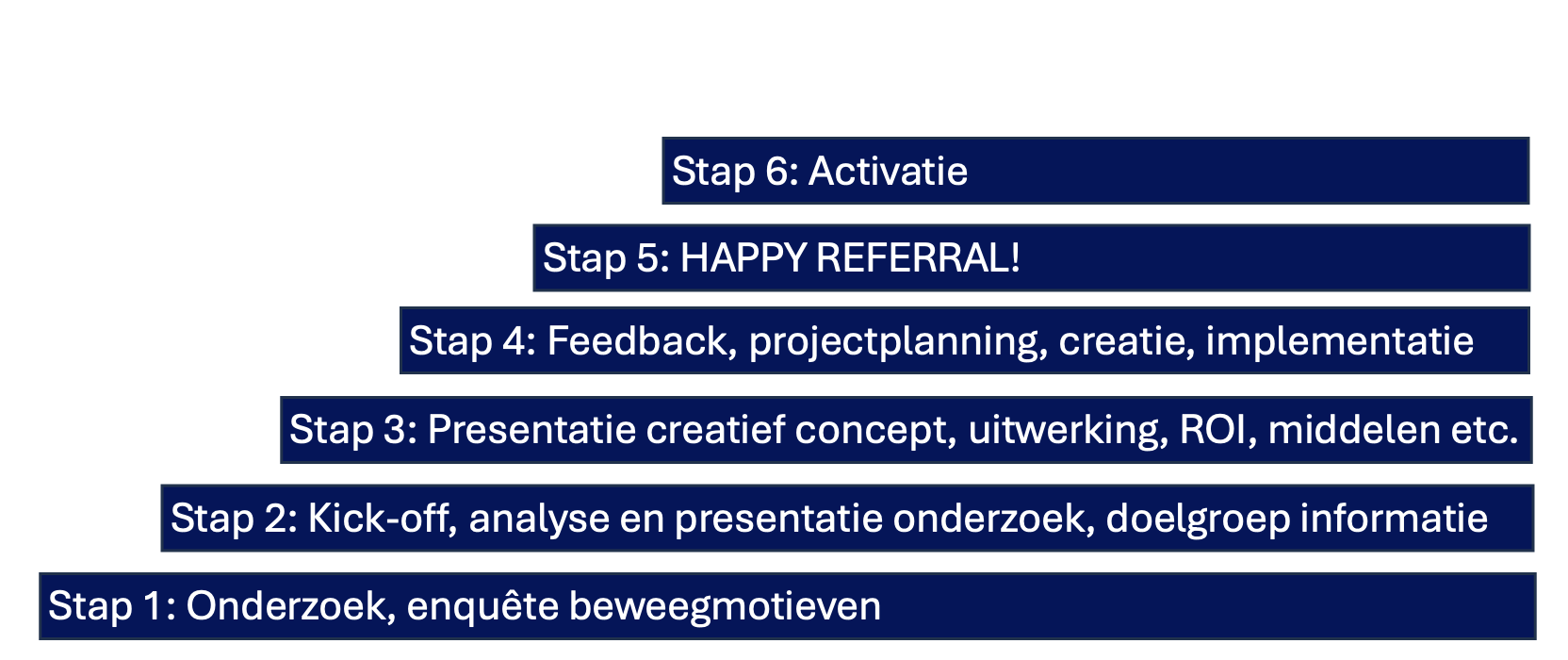 ‘The Six Degrees of Separation” oftewel, in 6 stappen verbonden met de hele wereld. In 6 stappen zetten wij samen met onze opdrachtgevers een succesvol referral programma neer. Met veel plezier en energie laten we je graag voorbeelden zien van onze opdrachtgevers. Best practices, wat ging er goed en wat kon beter. Wil je vrijblijvend meer informatie over onze werkwijze? Bel of stuur een mailtje!